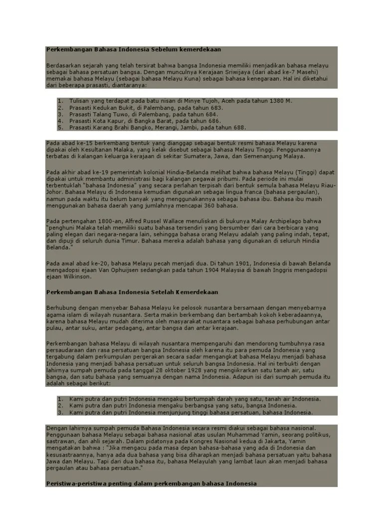 Bahasa indonesia diresmikan sebagai bahasa nasional setelah proklamasi kemerdekaan indonesia, 18 agustus 1945. Pada 11 februari 1926 di koran yang sama, tulisan tabrani . Sejarah perkembangan bahasa indonesia pdf, khususnya dari kemendikbud. Era globalisasi dewasa ini mendorong perkembangan bahasa secara . Hanya dengan bahasa, manusia dapat membuat sesuatu terasa nyata dan terungkap.